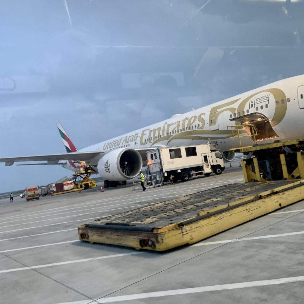 今回はエミレーツを使用したので、エミレーツ専用であるドバイ空港の第3ターミナルから出発です。朝早い時間でしたが、荷物のドロップもパスポートコントロールもすごい人で結構待ちました。荷物のドロップがなければ、事前チェックインしていれば専用の機械ですぐボーディングパスを発行できるのでそちらの方がおすすめです。