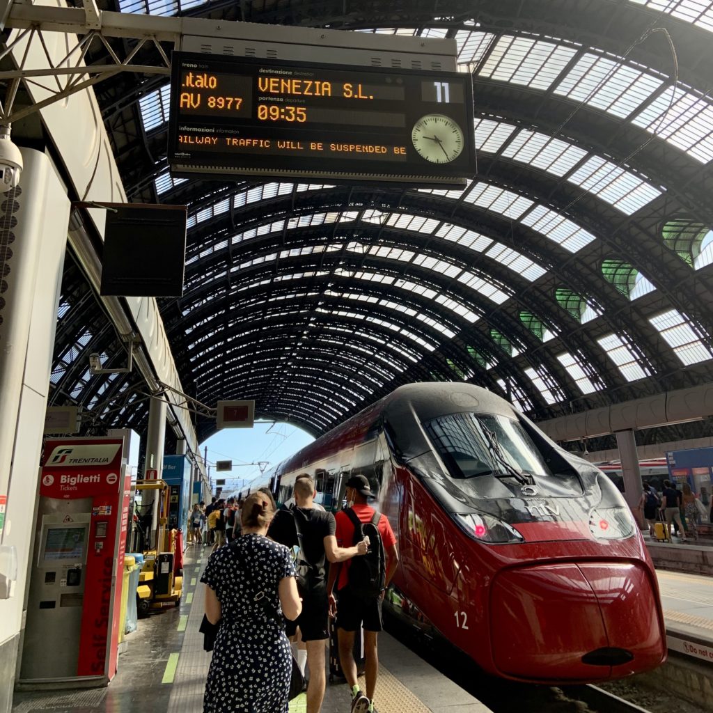 3日目の朝にヴェネツィアへ電車で移動しました。ミラノ〜ヴェネツィア間は旧国鉄トレニタリアの高速鉄道フレッチャロッサと私鉄のイタロが走っていて、どちらも移動時間は2時間強。予約のタイミングによって金額が違うので、こちらも早めのタイミングでの予約がオススメです。どちらが良いか色々調べてみましたが、私鉄のイタロはそのスタイリッシュな真っ赤な車体から「フェラーリのよう」と呼ばれているというのを発見し、まぁイタリアだしフェラーリだなと思いイタロを選択。事前に公式から予約しました。