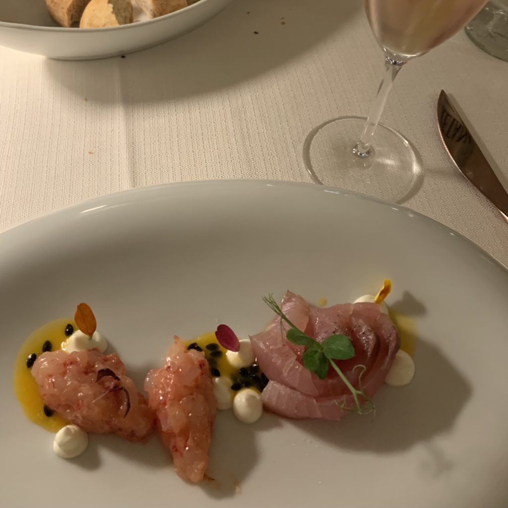 ヴェネツィアでも高級ホテルの一つとされる、アイ・レアーリの中にあるミシュランスターも獲得しているレストラン。ホテルの入口から落ち着いた空気が流れていて、観光客でごった返していた外とは別世界のよう。ヴェネツィア最後のディナーということで、コースとワインペアリングをお願いしました。