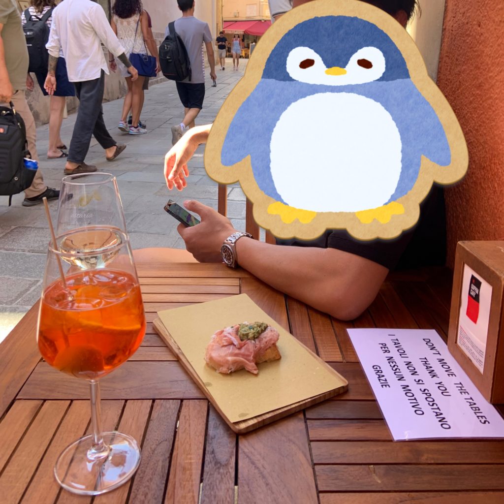 イタリア旅行でハマったのがこのアペロール・スピリッツ!昼飲みしたいけど、ビールはちょっと強すぎるな~って時に一番ちょうどいいカクテルです。Ostaria dai Zemeiの周りにも同じようなお店が立ち並ぶので、ハシゴするのも楽しい。いい雰囲気の中外で飲むのはやっぱり最高です!