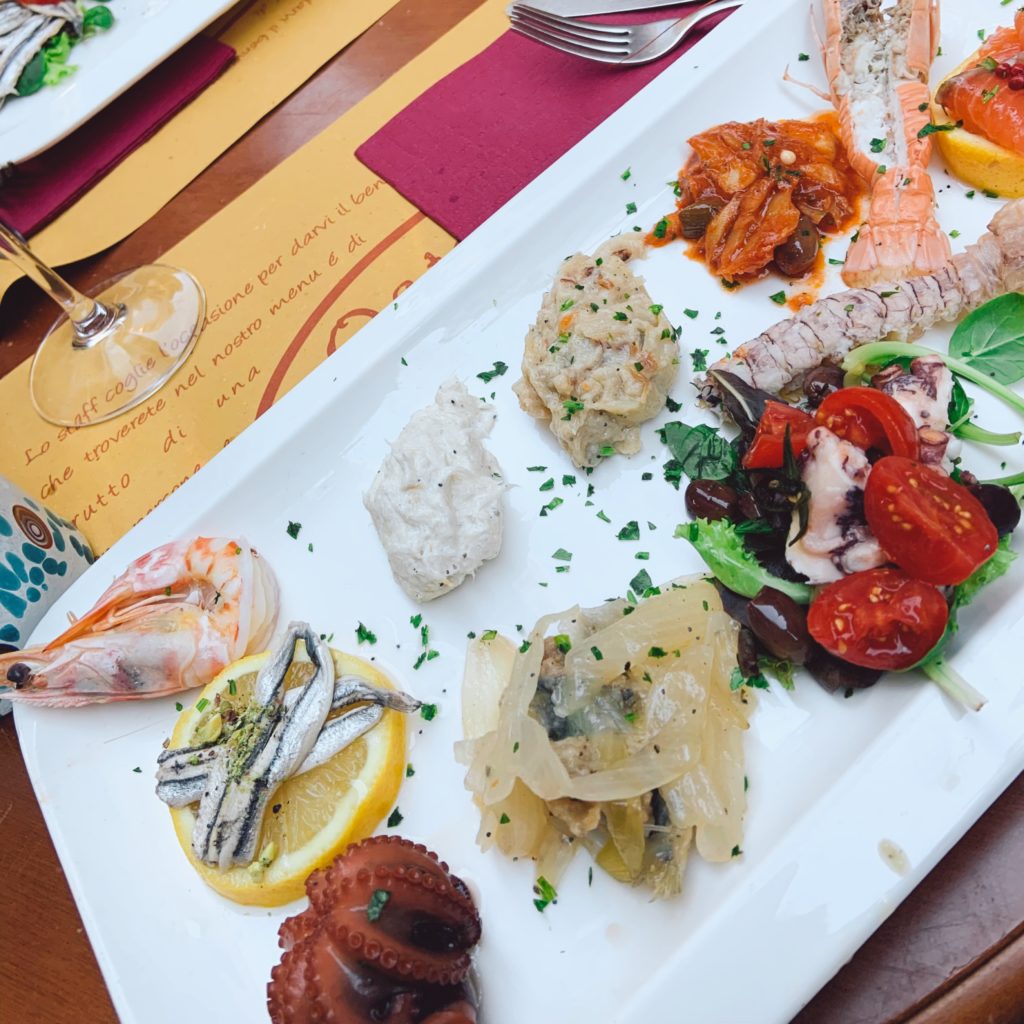 家族経営の小さな小さなオステリア。シーフードが人気のお店。シーフードのアンティパストはエビやらタコやらしゃこやら楽しめてワインが進む進む。白ワインと相性最高。